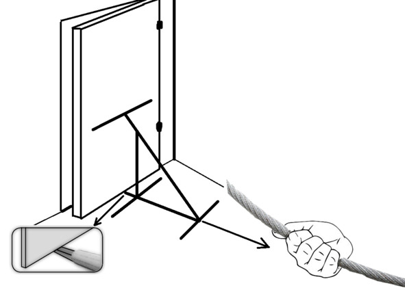 Решил сперва обдумать как можно вскрывать дверь, а некоторые двери не простые, не хуже, а то и получше моей будут. Болгаркой срезать петли, топором отжимать замок, выбивать замок кувалдой, все способы хороши. Во-первых, мало бензина, использовать его на болгарку, на все двери не хватит. Огнемёт важнее, на него тоже горючка нужна. Во-вторых, во время вскрытия двери я становлюсь совсем беззащитным, нужно придумать способ, при котором, во время самого открытия двери я буду находиться на расстоянии, готовым к встрече, с огнемётом. В голову приходила только одна мысль, подпирать дверь чем ни будь, а после вскрытия, верёвкой на расстоянии выдёргивать подпорку двери. Затем второй верёвкой открывать дверь, при этом я могу находиться далеко от неё и контролировать процесс нападения на меня. Это даст мне возможность во время вскрытия двери не подвергнуться нападению изнутри квартиры. Каннибал находящийся внутри закрытой квартиры не сможет резко открыть дверь, возле которой я вожусь, не вполне готовый к его нападению. Подпоркой стал кусок железной водопроводной трубы, так как лестничные площадки у нас стандартные, то определённой длины, для всех дверей. Верёвку заменил на трос, в случае применения огнемёта верёвка попросту сгорит, а вот трос он металлический.