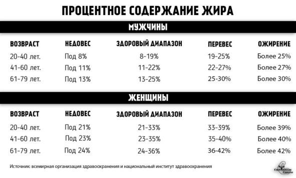 Самый распространённый способ определения лишнего веса — ИМТ (индекс массы тела), но он имеет определённые недостатки (к примеру, не учитывает массу мышц), и не позволяет выявить избыточный жир примерно у половины людей[5]. Поэтому учёные предложили более эффективный способ определения % жира в теле[6]– его можно вычислить по формуле, изображенной на следующем рисунке.