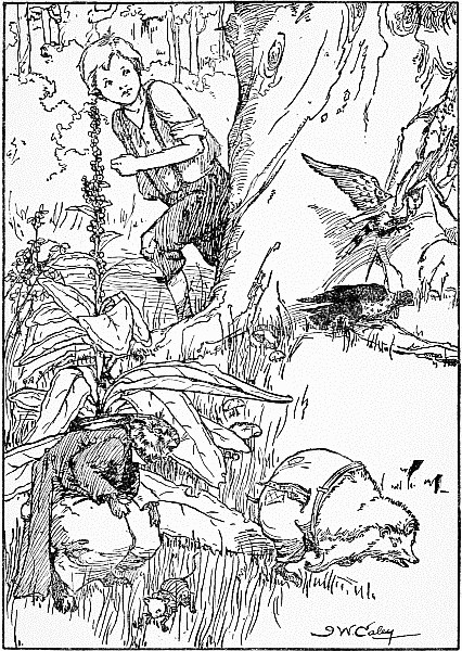 "There's no need of my saying that Mr. Crow was frightened. The idea of being bitten by a lump of clay nearly scared him white, and up into the tree he flew caw-cawing at the full strength of his lungs, while Mr. Turtle hung on the best he knew how, for it must have startled him a good bit to feel that instead of getting a dinner he was going up into the air like a balloon. Of course, old Slowly couldn't make any noise; but Mr. Crow was doing that for both of them, and down at the foot of the tree Cheeko sat laughing until, so Mr. Porcupine declares, it seemed certain he would burst.