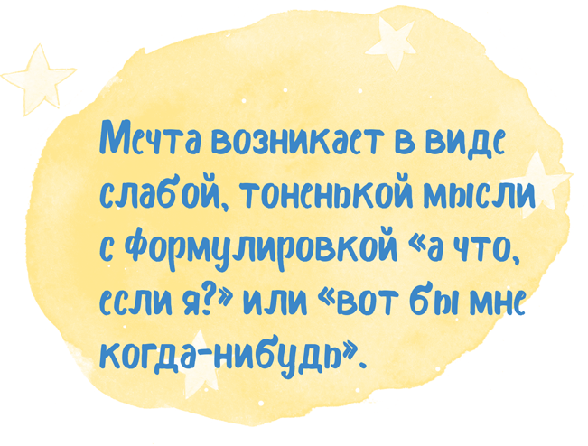 В этот момент, на самом раннем этапе, совершается очень серьёзный шаг: человек либо отмахивается от мечты («Куда мне! Я не смогу, это не для меня!»), либо воспринимает её наравне с другими идеями и планами («Почему нет? Надо разузнать, что для этого нужно»), то есть не боится мечтать. И это важно.