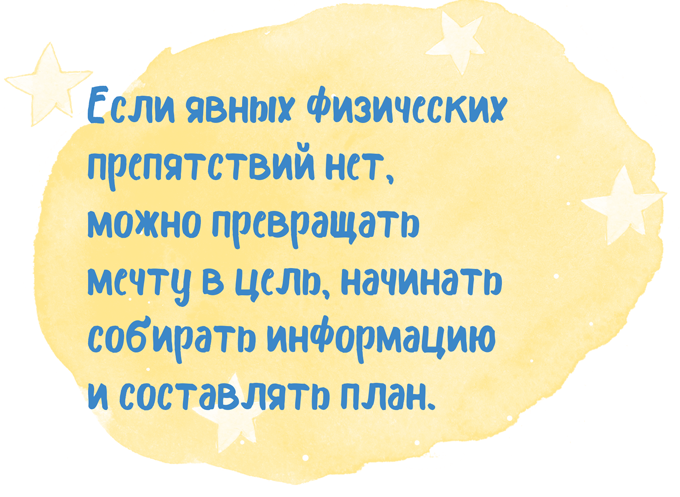 Если явных физических препятствий нет, можно превращать мечту в цель, начинать собирать информацию и составлять план. Иногда полезно отпустить мечту в свободное плавание и понаблюдать: как часто вы возвращаетесь к ней, видоизменяется ли она?