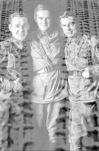 Я не шел ни в какое сравнение с ними: гимнастерка – б/у, х/б (бывшая в употреблении, хлопчатобумажная), на ногах – стоптанные ботинки, обмотки, и в завершение – синие диагоналевые галифе кавалерийского образца. Так нарядили нас, ополченцев. Спустя много лет я нашел старинную потемневшую фотографию того дня. Замечательный фотохудожник Валера Плотников сумел вытащить нас троих из тьмы забытого последнего нашего свидания, и я увидел себя – в том облачении. Ну и вид, и в таком, оказывается, наряде я отправился на фронт. Не помню, чтобы они смеялись надо мною, скорее, они возмущались тем, что неужели меня, вольноопределяющегося, как назвал Вадим, не могли обмундировать как следует.