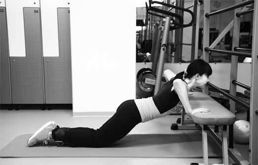На первый взгляд этот тест прост: нужно отжаться от низкой скамьи, стоя на коленях. Тело абсолютно прямое, выполнить 10 повторений. Существенный нюанс: при каждом отжимании грудь должна касаться скамьи, руки при этом должны быть согнуты в локтевых суставах под острым углом, подбородок максимально поднят, голова смотрит вперёд, фото 3 (а, б).