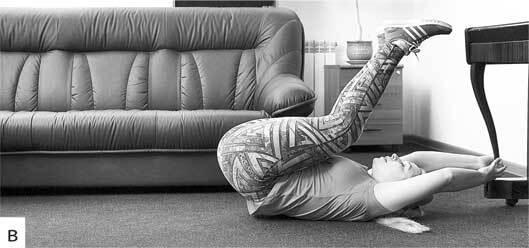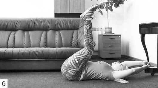 • ИП лежа на спине (можно держаться руками за головой за неподвижную опору) опускать ноги за голову, выполнить 20 повторений. Только не старайтесь в первых трех движениях сразу закинуть ноги за голову – в этом случае можно повредить мышцы спины. Достаточно будет выполнить касания ногами пола за головой (или шведской стенки) в последних 3–5 движениях, фото 6 (а, б, в).