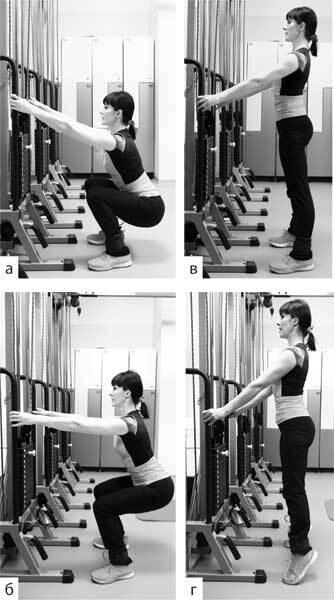• глубокие приседания и подъем на носки (до жжения в стопе), фото 4 (а, б, в, г).