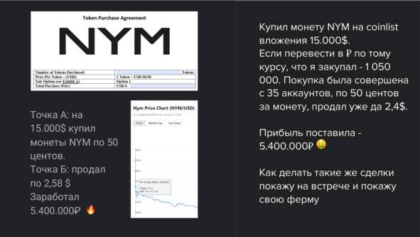 Возьмем, к примеру, историю с токеном Num. Любой может проверить эту информацию на популярных ресурсах вроде CoinGecko или CoinMarketCap. Num можно было приобрести через платформу CoinList всего за 50 центов. Мне удалось продать этот токен по цене 2 доллара 58 центов, что принесло прибыль в 5.400.000 рублей. (Рис.1)