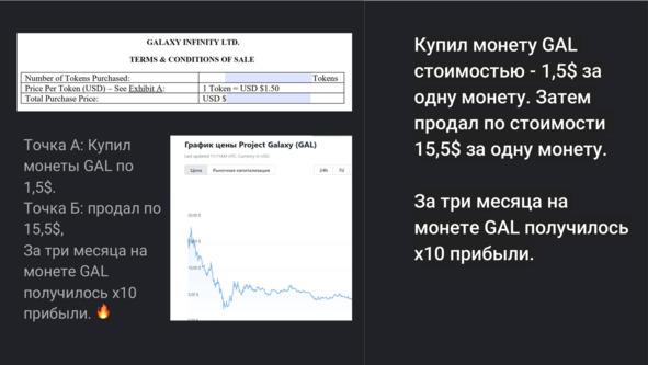 Аналогичная ситуация произошла с токеном GAL. Я купил его по 1.5 доллара до листинга на бирже и продал по 15,5 долларов (Рис 2).