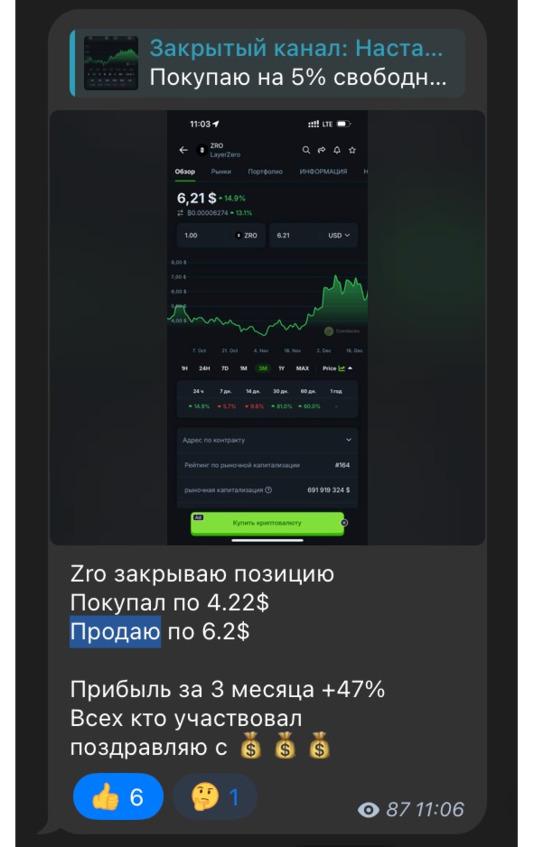 Например, 21 декабря я сообщил о продаже токена ZRO. Это не было спонтанным решением. Если вы просмотрите историю, то увидите, что 25 сентября я рекомендовал покупать этот токен. В той записи я подробно объяснил причины своего решения и указал цену, по которой я сам приобретал ZRO. Такой подход — рекомендовать покупку, а затем, спустя время, сообщать о продаже — характерен для моей стратегии и повторяется с множеством различных токенов.