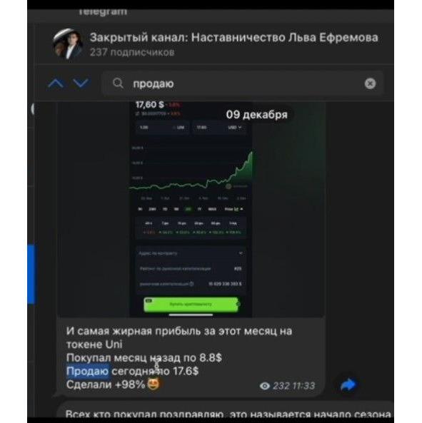 Другой яркий пример — история с токеном UNI. 9 декабря я сообщил о продаже этого токена с прибылью в 98%. Если вы вернетесь к записи от 8 ноября, то увидите мою рекомендацию покупать UNI, когда его цена составляла около 9 долларов. Этот случай отлично иллюстрирует потенциал прибыли, который можно реализовать, следуя моим советам.