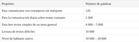 - El número de palabras que se necesita saber para los siguientes propósitos de usar un idioma extranjero