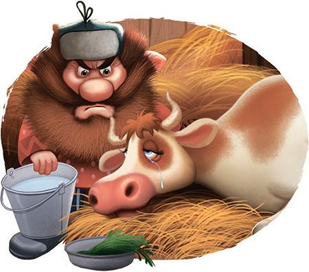 На следующее утро пришли Мохнатик и Веничкин на двор к Галоше и видят: корова лежит, рогами в пол уткнувшись. Галоша злой вокруг неё ходит, то по уху погладит, то за рога возьмёт. Ведро с едой к морде подвинет, кормить пытается – всё без толку. Лежит корова ни жива ни мертва. Из глаз слёзы катятся.