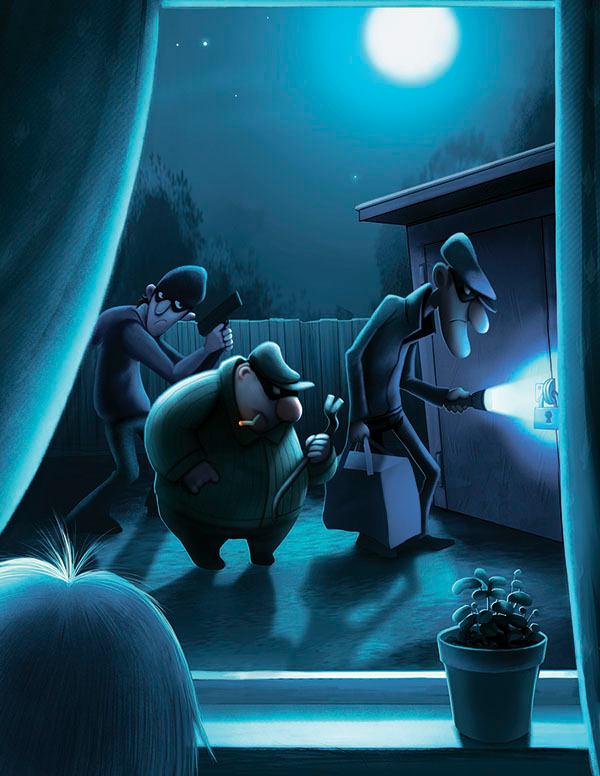 На следующую ночь, когда вся семья улеглась спать, а Мохнатик закончил уборку в доме и сел смотреть в окошко, он вдруг заметил, что на улице около гаража мелькнули три тени. Почёсывая бока, он перебежал к другому окну и вновь увидел три силуэта. Мохнатик испугался. Впервые в жизни он видел грабителей! У одного из них была большая сумка, у второго – какая-то металлическая палка в руках, а у третьего – пистолет! Они медленно подкрадывались к гаражу.