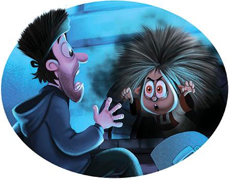 Тут Мохнатик включил радио. От неожиданности грабители замерли на месте. Домовёнок мигом оказался на кухне и зажёг свет. Грабители из прихожей увидели, что в доме не спят, и затаились. Один из них, который был с пистолетом, показал остальным знак «Тихо!» и подкрался к кухне. Он осторожно заглянул в открытую дверь, но никого не увидел. Вдруг в печипослышался шорох, с каждой секундой он становился громче. Грабитель отодвинул заслонку, а оттуда на него с широко растопыренными руками, чёрными взъерошенными волосами и горящими, как огонь, глазами выскочил Мохнатик! За руку схватил и стал затаскивать в печь! Откуда только у него столько сил взялось?! Домовёнок сам себе удивлялся. Ведь ещё никогда ему не приходилось такие страшные мордочки корчить. Чем сильнее кричал от страха грабитель, тем больше домовёнку нравилось его пугать! А чем больше нравилось, тем страшнее у него получалось!