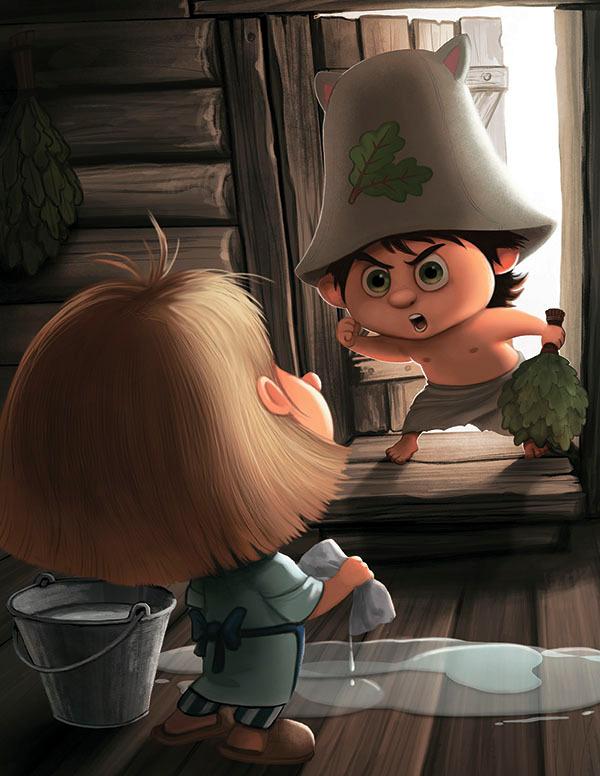 – Я баню свою отмыть пытаюсь! Не мешай! – ответил домовёнок и ещё усердней принялся оттирать стены.