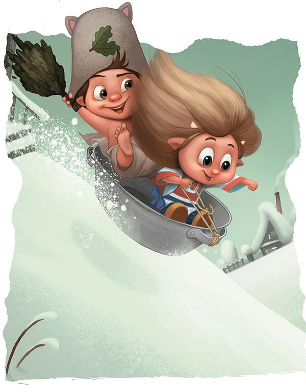 Веничкин ничего не ответил, лишь задорно махнул рукой, и они побежали кататься. Баневёнок привязал за ручку корыта верёвку и, как на санках, покатил Мохнатика к горе. У самого склона он разогнался, с разбегу оттолкнулся и запрыгнул в корыто! И они вместе с Мохнатиком понеслись вниз!