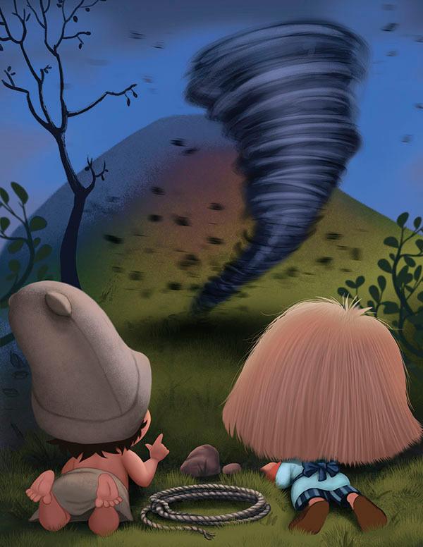 Домовёнок не на шутку испугался, но ничего не сказал. Баневёнок за минуту сделал верёвку из драного лыка, и они побежали к Лысой горе. Уже издали был виден высокий столб ветра. Это черти ведьму крутили, раскачивали, волшебных сил помогали набраться. Они то выше её поднимали, то опускали к самой земле. Слышен был их дикий смех. А ведьма руки растопырила, глаза закрыла, ветер обнимает, силу его забирает.