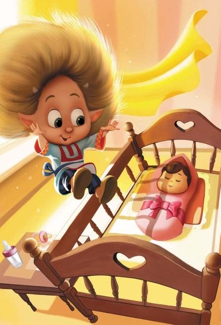 Как же удивился домовёнок! Завёрнутый в одеяльце, как гусеничка, в кроватке сладко посапывал маленький человечек. Мохнатик сразу понял, что это девочка. Её пухлые щёчки, розовые губки и аккуратный носик очень ему понравились. Вдруг она открыла глазки и улыбнулась. Он улыбнулся в ответ и раскрыл свёрточек. Осторожно потрогал маленькие ручки, ножки. Девочка засмеялась. Мохнатик заулыбался и сел рядом. Он был абсолютно счастлив – в доме появился ребёнок!