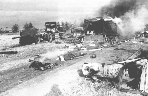Я подлез к краю дороги. С другой стороны, с рощи, уже шли немецкие солдаты. Я снял ППШ с предохранителя и начал стрелять короткими очередями. Вокруг был просто ад. Целые, или хотя бы стреляющие танки обстреливали рощу, солдаты стреляли с края дороги, машины горели. Но, несмотря на огонь, немцы упрямо подходили все ближе к дороге, и этому я не мог найти адекватного объяснения. Скорее всего, так мне показалось, что в отчаянной атаке на вражескую колонну немцы, потерявшие всякую надежду на спасение, решили уничтожить как можно больше советских солдат. Из-за дымовой завесы, которую они, немцы, поставили в самой середине рощи, было невозможно в кого-либо попасть, стрельба велась на вспышки выстрелов, какие-то образы, мелькающие в дыму. Заградительным огнем красноармейцы время от времени заставляли фашистов залечь. Спустя минуты две такого хаоса ко мне снизу подполз радист.