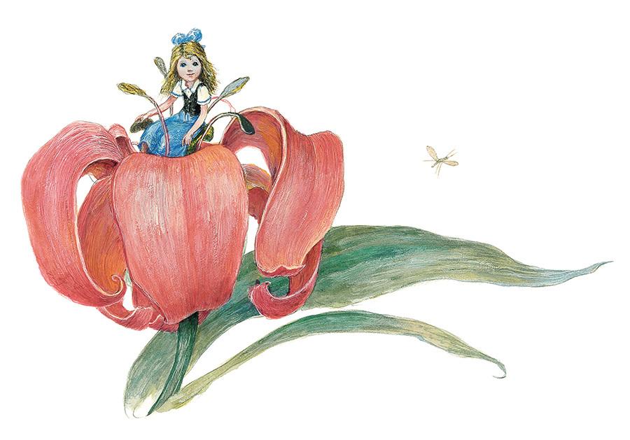 Что-то щёлкнуло, и цветок распустился совсем. Это был точь-в-точь тюльпан, но в самой чашечке на зелёном стульчике сидела крошечная девочка и за то, что она была такая нежная, маленькая, всего с дюйм ростом, её и прозвали Дюймовочкой.