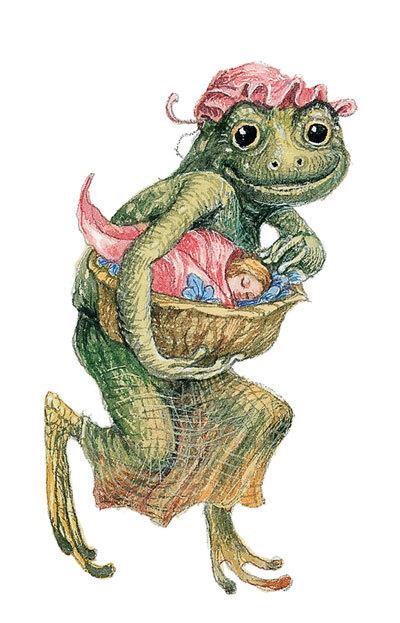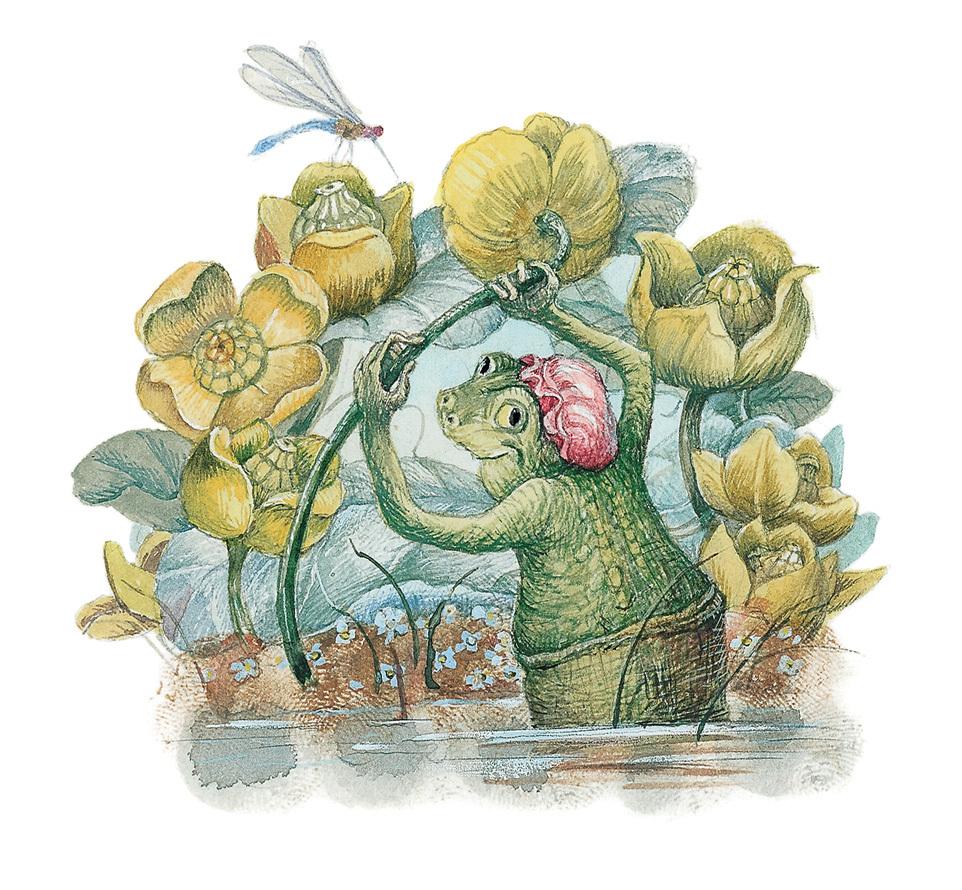 А старая жаба сидела внизу, в тине, и убирала своё жилище тростником и жёлтыми кувшинка-ми – надо же было приукрасить всё для молодой невестки! Потом она поплыла со своим безобразным сынком к листу, где сидела Дюймовочка, чтобы взять прежде всего её хорошенькую кроватку и поставить в спальне невесты. Старая жаба очень низко присела в воде перед девочкой и сказала: