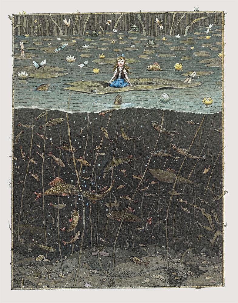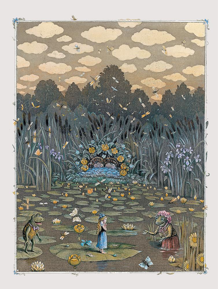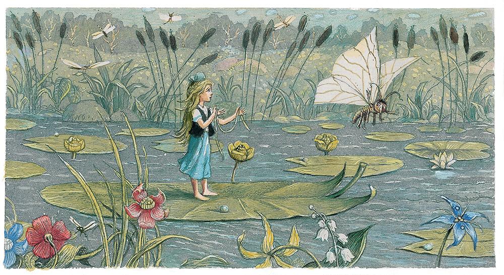– Тише ты! Она ещё проснётся, пожалуй, да убежит от нас, – сказала старуха жаба. – Она ведь легче лебединого пуха! Высадим-ка её посередине реки на широкий лист кувшинки – это ведь целый остров для такой крошки, оттуда она не сбежит, а мы пока разберём там, внизу, наше гнёздышко. Вам ведь в нём жить да поживать.