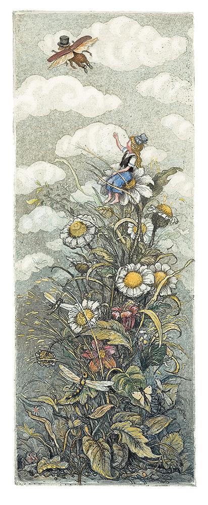Мимо летел майский жук, увидал девочку, обхватил её за тонкую талию лапкой и унёс на дерево, а зелёный листок поплыл дальше, и с ним мотылёк – он ведь был привязан и не мог освободиться.