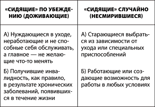 В эту группу попали и истинные «колясочники» с необратимыми потерями в здоровье, которые мешают им адаптироваться к активному обществу из-за множества преград, связанных прежде всего с отсутствием бытовых условий: пандусов, специальных лифтов в общественном транспорте, правильных светофоров и прочего. Я считаю, что общество должно активно помогать этим не сдавшимся из-за травмы или болезни людям осваивать окружающее пространство, но задача этой книги заключается в оказании не социально-психологической, а медико-реабилитационной помощи.