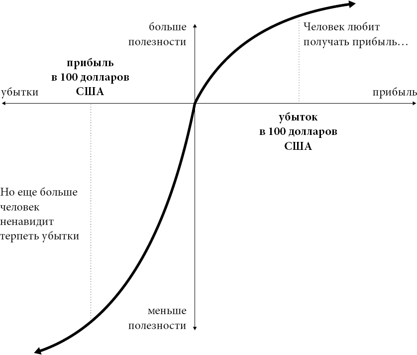 Этот график в статье так запал мне в голову, что я нарисовал такой же рисунок на своей доске рядом со Списком. Взгляните на него еще раз. В этой S-образной кривой сосредоточена величайшая мудрость о человеческой натуре. Верхняя часть рисунка, относящаяся к прибыли, повторяет форму графика обычной функции полезности богатства, отражая идею уменьшающейся чувствительности. Но обратите внимание: функция убытков также отражает уменьшающуюся чувствительность. Разница между потерей 10 долларов и 20 долларов ощущается гораздо сильнее, чем разница между потерями в 1300 долларов и 1310 долларов США. В этом отличие от стандартной модели, потому что, начиная с определенного уровня благосостояния на рис. 3, убытки фиксируются как движение вниз по оси полезности богатства, означая, что каждая потеря ощущается более болезненно. Если о приросте благосостояния мы беспокоимся все меньше и меньше, то из этого следует, что о приросте потерь в благосостоянии мы волнуемся все больше и больше.