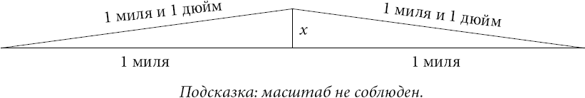 Возьмем одну половину железнодорожного пути. У нас есть прямоугольный треугольник, длина основания которого составляет одну милю, а гипотенуза – одну милю плюс один дюйм. Чему равна высота треугольника? Другими словами, на какое расстояние рельсы приподнимаются над землей?