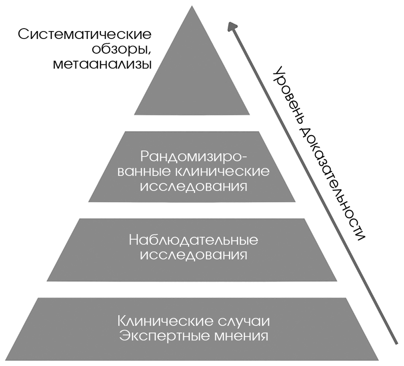 На вершине находятся одни из самых достоверных источников медицинской информации – это рандомизированные контролируемые исследования (РКИ), метаанализы (статистический метод, позволяющий объединить результаты отдельных исследований) и систематические обзоры.