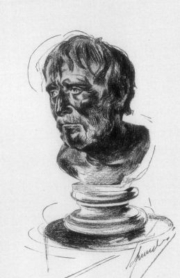 Socrates did not marry until he was about forty. His wife was scarcely twenty. Of his courtship we know nothing, but sure it is Socrates did not go and sue for the lady's hand in the conventional way, nor seek to gain the consent of her parents by proving his worldly prospects. His apparel was costly as his purse could buy, not gaudy nor expressed in fancy. It consisted of the one suit that he wore, for we hear of his repairing beyond the walls to bathe in the stream, and of his washing his clothing, hanging it on the bushes and waiting for it to dry before going back to the city. As for shoes, he had one pair, and since he never once wore them, going barefoot Summer and Winter, it is presumed that they lasted well. One can not imagine Socrates in an opera-hat—in fact, he wore no hat, and he was bald. I record the fact so as to confound those zealous ones who badger the bald as a business, who have recipes concealed on their persons, and who assure us that baldness has its rise in headgear.