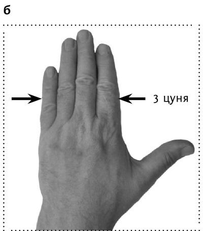 Чтобы отмерить 3 цуня, складываем четыре сомкнутых пальца выпрямленной (правой или левой) ладони, см. фото 1.2, б.