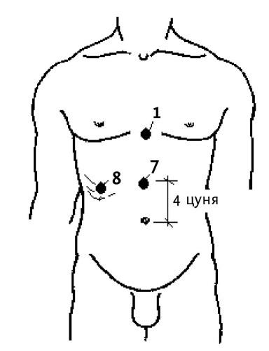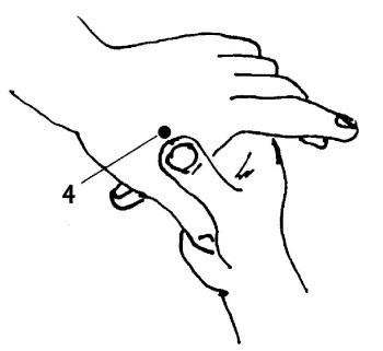 При резком болевом синдроме в области сердца можно произвести сильный удар тремя пальцами по точке 5, это служит отвлекающим приемом.