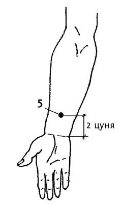 Функция точки 5 (нэй-гуань) – лечение болей в печени, а также болезней расстройства нервной системы и болей в области сердца.