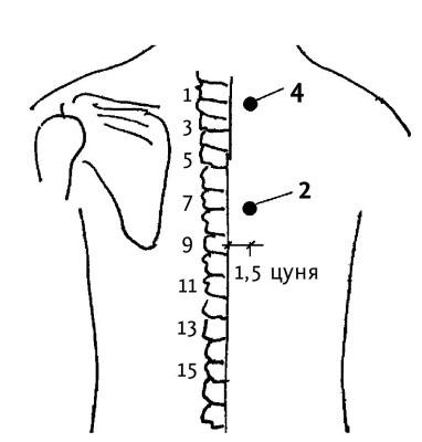 Точка гэ-шу («диафрагма и точка спины») расположена на 1,5 цуня справа от позвоночника на уровне 7-го грудного позвонка (рис. 2.2, б).