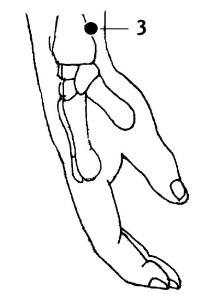 Точка 3 расположена на 2 сложенных пальца над запястьем под большим пальцем (рис. 2.1, в). Для нахождения точки скрестите руки через промежутки между большими и указательными пальцами. В углублении на уровне указательного пальца массирующей руки вы найдете нужную точку на массируемой руке.