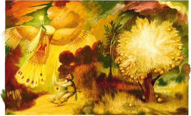 Половина ночи прошла, ему и чудится: в саду свет. Светлее и светлее. Весь сад осветило. Он видит – на яблоню села Жар-птица и клюет золотые яблоки.