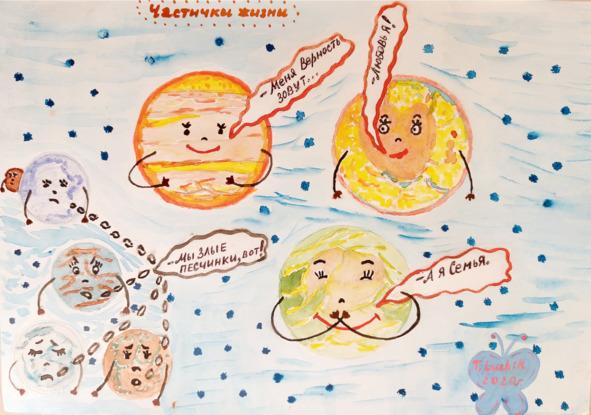 Однажды в самый приятный летний день добрая песчинка по имени Семья летала и порхала от счастья. Ей в этом помогал весёлый ветерок, подгоняющий её то туда, то сюда, ведь она должна развить в себе качества радости, исходя из своего предназначения — создание радости в семье. Поэтому ветерок почти всегда присутствовал в её жизни. А тёплый дождик своими приятными шариками влаги дарил ей мягкость характера, необходимую чуткость и умение сопереживать, которые так нужны в семье. Ну а улыбчивое, приветливое, несущее с собой удачу и позитив, солнышко своими лучиками касалось до граней песчинки, вселяя в неё успех и оптимизм. В таком стиле и темпе проходила жизнь песчинки, у неё было много друзей, но самыми верными и преданными были: песчинка по имени Любовь (друзья по-мягкому обращались к ней, как к Любчику) и песчинка с именем Верность (ласковое имя при рождении Верунчик).