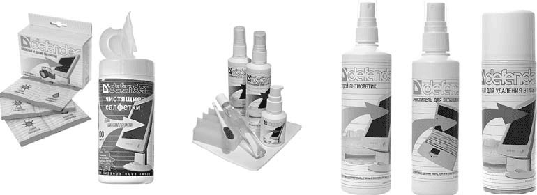 Рис. 2.9. Салфетки для очистки оптики и мониторов (слева), универсальный набор чистящих средств(в центре)и чистящие средства разного действия(справа)