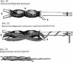 Рис. 10. Западносибирский мотылек, Рис. 11. Западносибирский мотылек с намотанной блесной, Рис. 12. Саратовская зимняя удочка