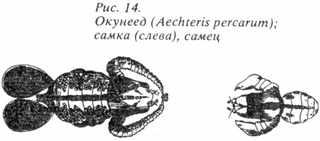 Рис. 14. Окунеед (Aechteris percarum); самка (слева), самец