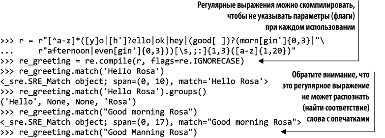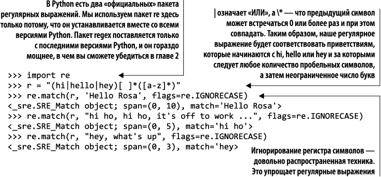 27 Некоторые грамматические правила могут быть реализованы в виде абстракции из теории вычислительных наук — конечного автомата. Регулярные грамматики можно реализовать в виде регулярных выражений. Существует два пакета языка Python, позволяющих работать с конечными автоматами для регулярных выражений: встроенный re и пришедший ему на замену regex, который нужно устанавливать отдельно. Конечные автоматы представляют собой всего лишь деревья операторов if…then…else для каждого токена (символа, слова, n-граммы) или действия, на которые автомат должен отреагировать или которые должен сгенерировать.