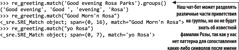 В этой главе вы встретитесь с простыми алгоритмами разделения строк на слова. Вы научитесь извлекать пары, тройки, четверки и даже пятерки токенов. Такие комбинации называются n-граммами. Пары слов называются биграммами, тройки — триграммами, четверки — 4-граммами и т.д. Использование n-грамм позволяет машине знать о таких словах, как ice cream, а также о составляющих его ice и cream. Еще одна биграмма, которую нет смысла разделять, — Mr. Smith. В ваших токенах и векторном представлении документа должно быть место как для Mr. Smith, так и для Mr. и Smith.