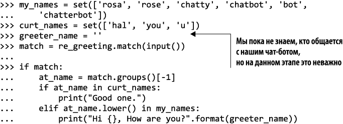 Извлечение токенов из документа требует некоторых манипуляций со строками, выходящих за рамки возможностей метода str.split(), применявшегося в главе 1. Необходимо отделить знаки препинания от слов, например кавычки в начале и в конце высказывания. Нужно также разбить сокращения, такие как we’ll, на составляющие их слова. После идентификации в документе токенов, подлежащих включению в словарь, вам придется воспользоваться регулярными выражениями, чтобы попытаться объединить в ходе стемминга слова со схожим смыслом. Далее мы сформируем векторное представление документов — мультимножество слов, и попытаемся воспользоваться этим вектором для усовершенствования распознавания приветствий по сравнению с приведенным в конце главы 1 вариантом.