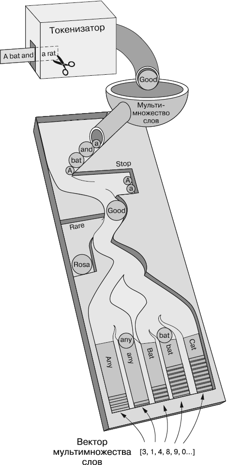 При обработке естественного языка процесс формирования числового вектора на основе текста — выделение признаков с большим количеством потерь. Тем не менее векторы мультимножеств слов (BOW) сохраняют достаточную долю информационной составляющей текста для создания полезных и интересных моделей машинного обучения. Методы анализа тональностей из конца этой главы — те же самые, которые сервис Gmail использовал, чтобы спасти нас от потока спама, почти сделавшего электронную почту бесполезной.