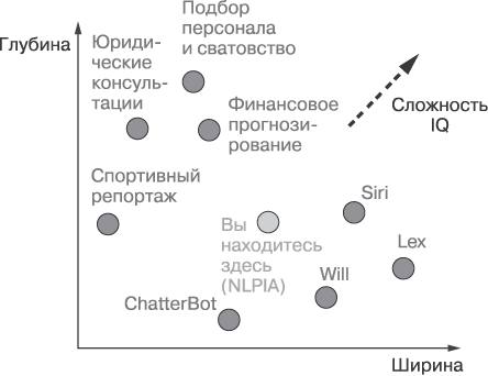 Вам нужно использовать оба подхода (нейронные сети и вручную запрограммированные алгоритмы) по мере построения конвейера NLP для чат-бота, способного общаться в рамках заданной области знаний. Так вы получите навыки для выполнения задач обработки естественного языка в вашей отрасли промышленности или предметной области. Попутно вы, вероятно, получите представление о том, как расширить сферу возможностей конвейера NLP. Рисунок 1.5 демонстрирует место чат-бота среди уже существующих систем обработки естественного языка. Представьте чат-боты, с которыми вы уже общались. Как вы думаете, где их место на таком графике? Пытались ли вы оценить их интеллект, задавая сложные вопросы или проводя что-то вроде теста IQ?48 В следующих главах будет возможность сделать именно это, чтобы решить, где ваш чат-бот находится на диаграмме.