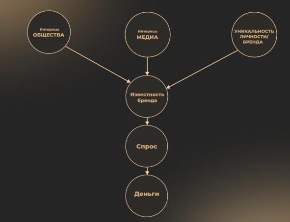 Интересы общества + интересы медиа-пространства + уникальность личности/бренда = известность бренда. Всё это рождает спрос и деньги. Ваш контент не будет интересен обществу, СМИ, если вы не будете понимать их интересы. Важно еще обращать внимание на повестку дня, актуальность поднимаемых вопросов. Также без проявления уникальности вас или вашего бренда — к нему не будет проявляться интерес, и он ничем не будет отличаться от других брендов.