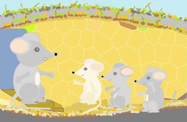 У одной мамы-мышки родились три дочки-мышки, одна беленькая и две сереньких. Когда мышки немножко подросли, стала их мама учить, как зернышки лущить, как шубку чистить, как запасы на зиму собирать, как от врагов спасаться.
