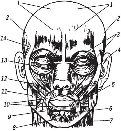 Основные мышцы лица: 1 – сухожильный шлем и надчерепные мышцы; 2 – височные мышцы; 3 – круговая мышца глаза; 4 – мышца, поднимающая угол рта; 5 – щечная мышца; 6 – мышца, опускающая нижнюю губу; 7 – подкожная мышца шеи; 8 – подбородочная мышца; 9 – мышца, опускающая угол рта; 10 – круговая мышца рта; 11 – жевательная мышца; 12 – большая скуловая мышца; 13 – носовая мышца; 14 – мышца ушной раковины
