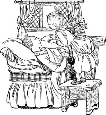 The Princess Alicia, who happened to be looking in at the chamber-door, asking about breakfast, was very much alarmed when she saw her Royal Mamma in this state, and she rang the bell for Peggy, which was the name of the Lord Chamberlain. But remembering where the smelling-bottle was, she climbed on a chair and got it, and after that she climbed on another chair by the bedside and held the smelling-bottle to the Queen’s nose, and after that she jumped down and got some water, and after that she jumped up again and wetted the Queen’s forehead, and, in short, when the Lord Chamberlain came in, that dear old woman said to the little Princess, “What a Trot you are! I couldn’t have done it better myself!”